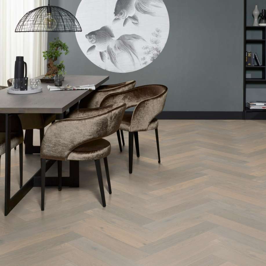 Geniet van de elegante uitstraling van de Beverly Hills visgraat vloer in rustiek dubbel gerookt wit. Deze vloer is niet alleen slijtvast en onderhoudsvriendelijk, maar ook eenvoudig te installeren, perfect voor elk interieur.